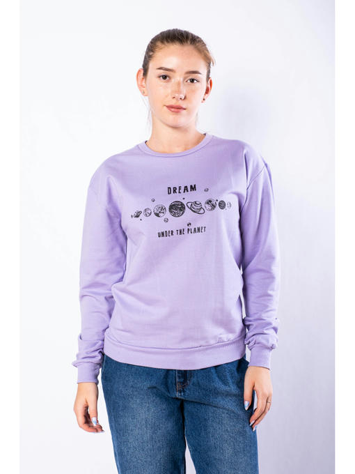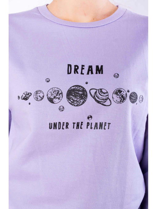 Стильный женский свитшот выполненный из однотонного трикотажа в состав которого входит натуральный хлопок с добавлением полиэстера, обладает приятными тактильными свойствами и благодаря универсальному фасону обеспечивает комфортную посадку изделия по фигуре. Актуальный принт с графическим изображением планет и текстом DREAM under the planet, выгодно дополняет образ модели. Широкая цветовая палитра, предоставляет возможность выбора на любой вкус.