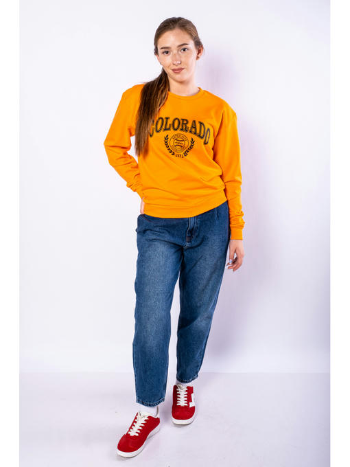 Стильный, однотонный женский свитшот, выполнен из натурального хлопкового трикотажа с добавлением полиэстера. Благодаря такому составу, изделие в меньшей степени склонно к усадке и растяжению продолжительное время сохраняя привлекательный внешний вид. Расположенный на груди актуальный принт с надписью COLORADO, выгодно дополняет образ изделия.