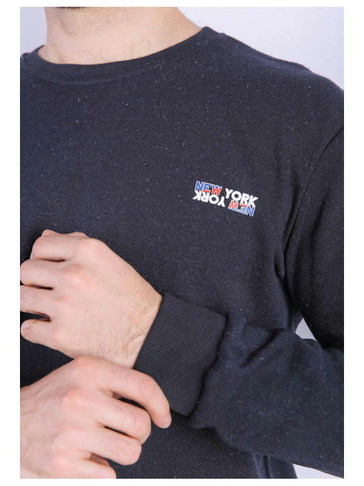 Стильный и комфортный мужской свитшот на тонком флисе пошит из хлопкового трикотажа в винтажном стиле с характерными цветными вкраплениями и неровностями полотна, которые свойственны такому типу плетения. На груди слева расположен небольшой принт. Манжеты рукавов, а также горловина и пояс изделия выполнены из качественной трикотажной резинки.