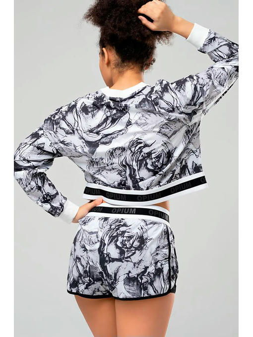Женский спортивный кроп-топ с рукавами. Выполнен из тончайшей микрофибры с модным абстрактным принтом. Обтачка горловины и манжеты – из эластичного хлопка. Снизу – брендированная резинка. Стильная и модная вещь в вашем спортивном гардеробе. Как с леггинсами, так и с шортами, например PF-79