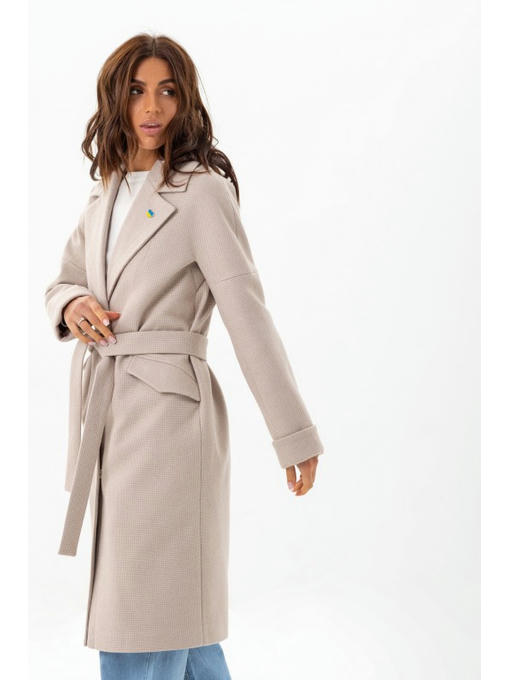 Свободное пальто имеет стильный оверсайз фасон, в комплекте есть пояс. Материал наряда – шерстяная ткань в мелкую клеточку. Длина пальто за колено. Рукав спущенный, есть манжеты. Отложной воротник с не глубоким V-образным вырезом. Карманы с клапанами. По центру спинки проходит шов. На лицевой части внешняя пуговица, основная застежка – кнопки.