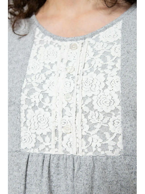 Теплое домашнее платье-сорочка из мягкого трикотажа с небольшим ворсом. Чуть расклешенный силуэт, отрезное под грудью, длинный рукав. Круглый вырез горловины дополняет милая кружевная вставка на груди, украшенная перламутровыми пуговками. Незаменимая вещь в загородном доме в холодную погоду, обеспечивающая уют и комфорт