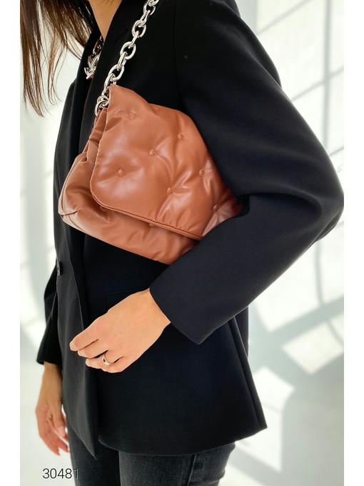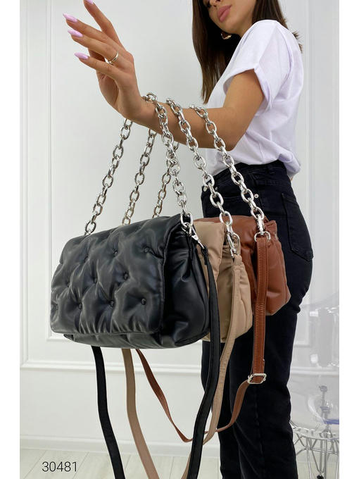 Прямоугольная сумка с отделкой заклепками. Ремень – цепочка и дополнительный съёмный регулируемый ремень из искусственной кожи. Клапан на кнопке, отделения с застёжкой на молнию, внутри отделение и карман на молнии и несколько открытых карманов для мелких деталей.