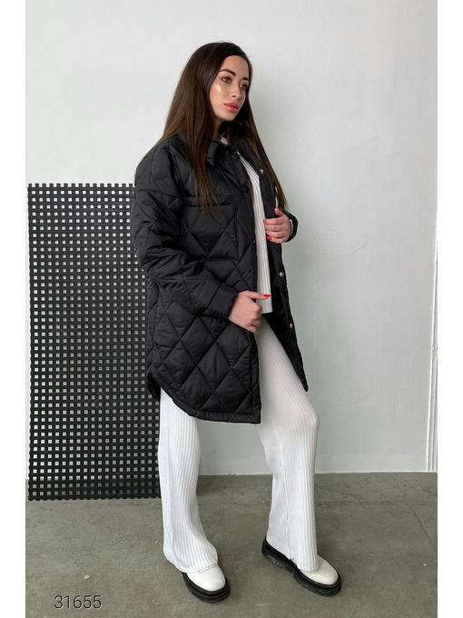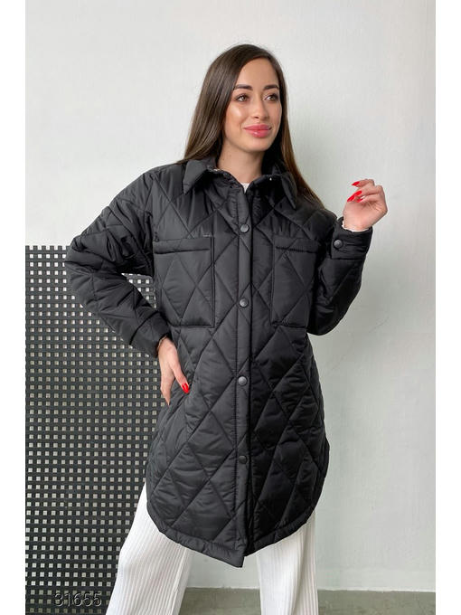 Куртка свободного кроя из стеганной плащевки. Отложной ворот, заниженная линия плеч, накладные нагрудные карманы. Фигурные боковые вырезы по нижней кромке, есть подкладка, манжеты и планка на кнопках.