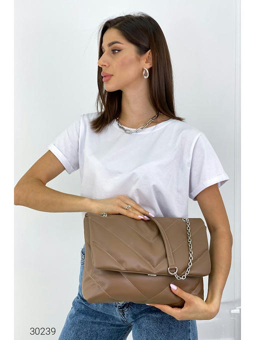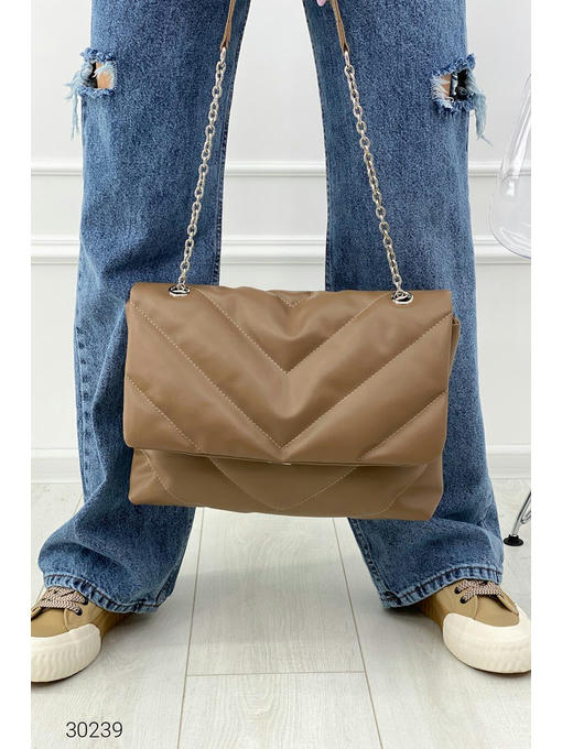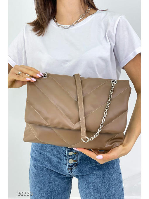 Сумка из мягкой стеганной искусственной кожи. Ремень – цепочка, откидной клапан на защелкивающейся застежке, отделение с застёжкой на молнию. Внутри дополнительное отделение и карман на молнии и несколько открытых карманов для мелких деталей.