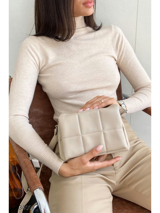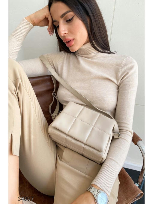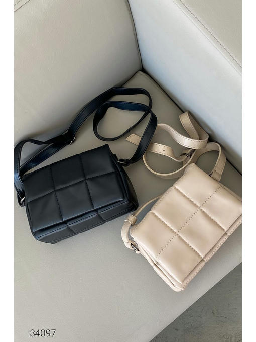 Прямоугольная стеганная сумка из мягкой искусственной кожи. Откидной клапан на кнопке с магнитом, съёмный регулируемый плечевой ремень, длина – 110 см. Внутри два отделения, есть подкладка.