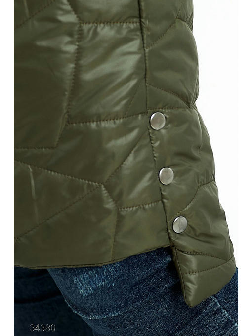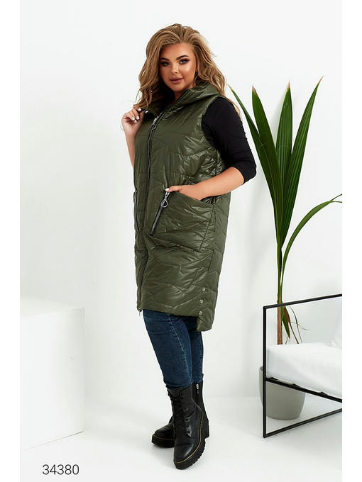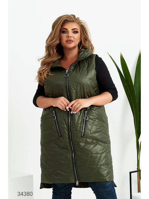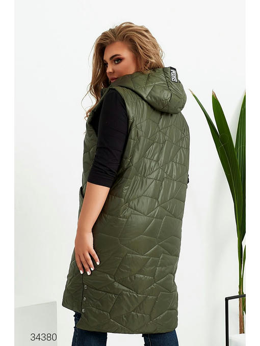 Стеганный дутый жилет из плащёвки на синтепоне. Объёмный капюшон с нашивкой, накладные карманы с декоративными молниями. Асимметричный нижний край с декоративными кнопками по бокам, застёжка на молнию.