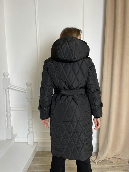 Стеганое пальто с капюшоном подойдет для прогулок, работы, путешествий. Универсальная вещь для стильных городских образов модного сезона.Стеганное пальто с капюшоном, стеганное ромбами, изготовлено из качественной плащевой ткани. Прямого силуэта, длиной миди.Застегивается на пластиковую молнию и кнопки. Воротник стойка и пристежной капюшон. Рукав длинный, втачной, декорирован патом на кнопке. На полочке расположены карманы прорезные с листочкой. В стеганом пальто присутствуют шлевки и съёмный пояс, из основной ткани.