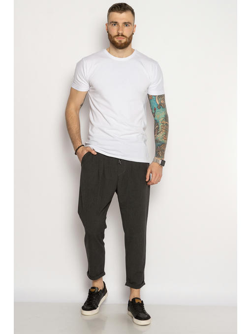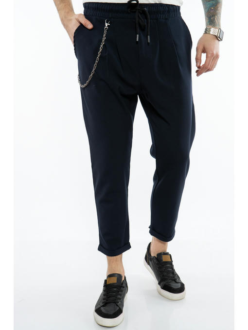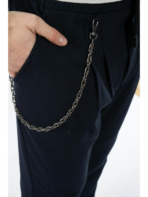 Стильные мужские брюки с защипами, выполнены из костюмной поливискозы, и дополнены декоративным подвесом из металлической цепочки с двумя карабинами. Дополнительное удобство, обеспечивается благодаря эластичному поясу с шнуром затяжки, а также боковым и задним карманам. В данной модели, гульфик не является функциональным и несёт исключительно декоративную функцию. Зафиксированные строчкой подкаты штанин, удачно дополняют образ изделия.
