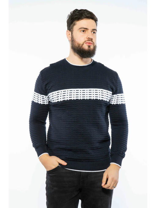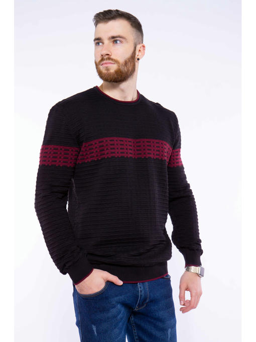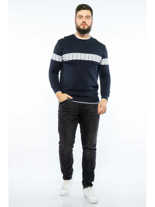 Оригинальный мужской свитер с контрастной декоративной отделкой узором спереди и сзади, а также вороту, манжетам и низу изделия, отличается прекрасной посадкой и деликатным внешним видом.