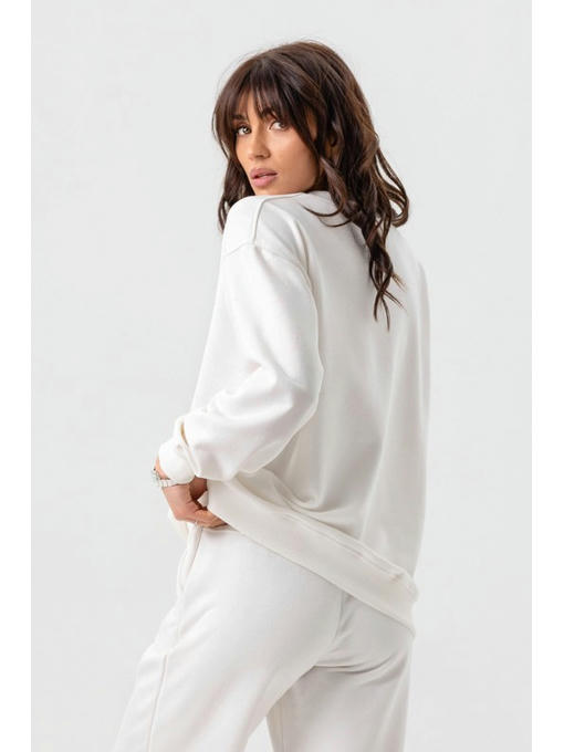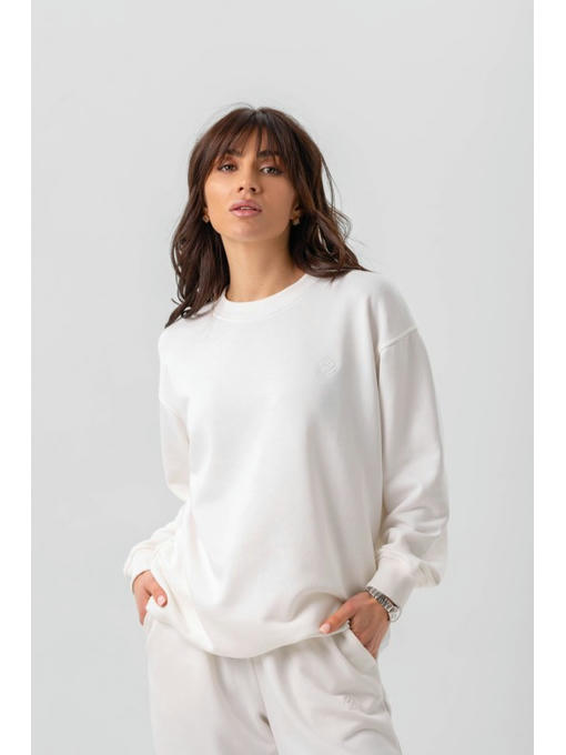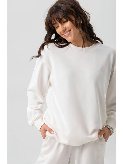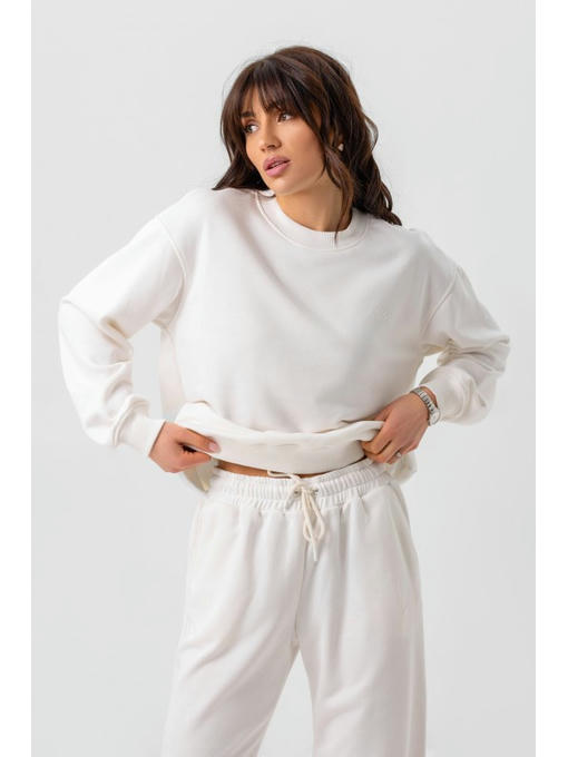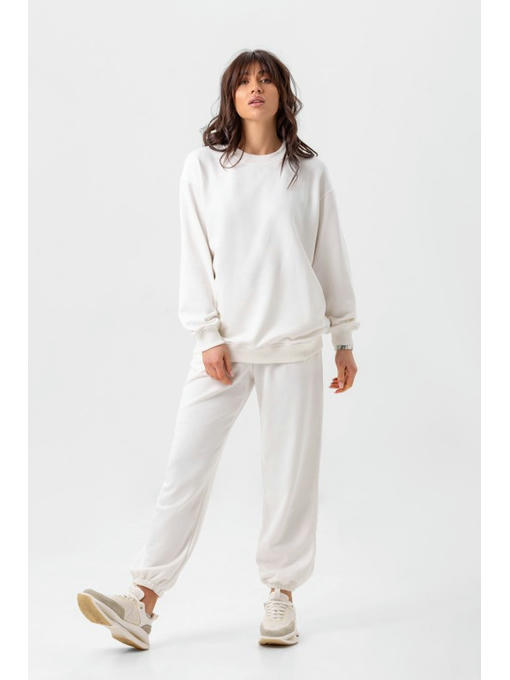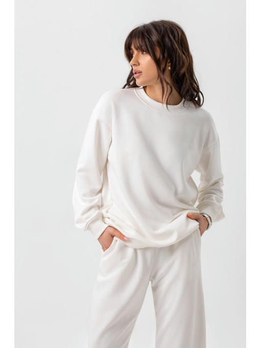 Стильный однотонный свитшот – базовый вариант одежды на каждый день. Свитшот имеет свободный крой, спущенное плечо. На рукавах манжеты из рибаны. Такой же элемент на круглом вырезе и по низу изделия. Свитшот сделан из плотной ткани трехнитки, долго сохраняющей вид новой вещи. Материал очень качественный и приятный коже, поэтому носить такую одежду одно удовольствие. Базовый женский свитшот можно сочетать с широкими брюками палаццо или джоггерами в тон, создав крутой спортивный костюм в стиле кэжуал.
