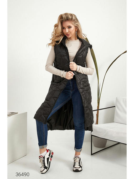 Жилет из качественной плащёвой ткани на синтепоне. Объёмный капюшон, боковые накладные карманы, асимметричный нижний край с боковыми разрезами. Есть подкладка с контрастным принтом, застёжка на молнию.