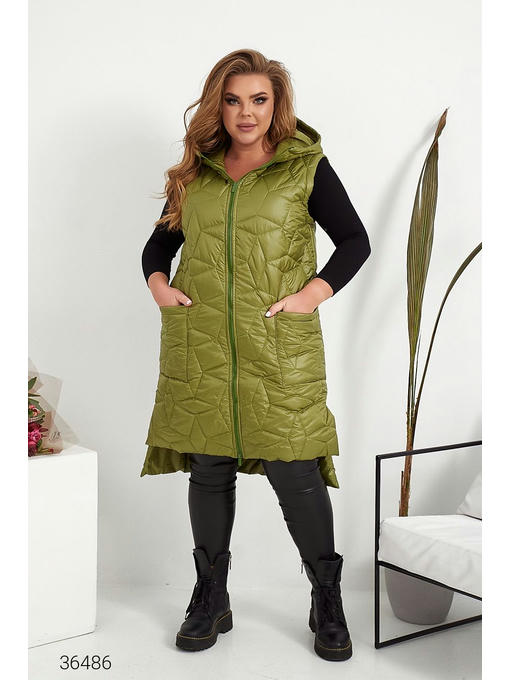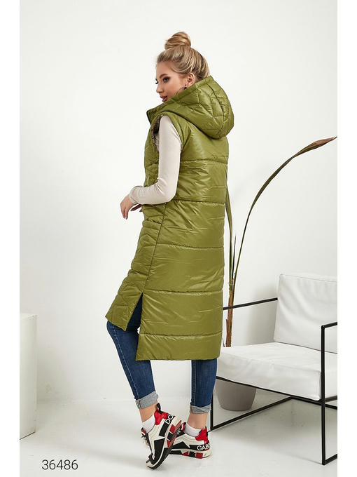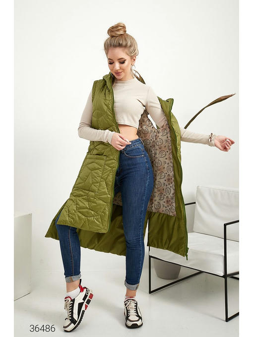 Жилет из качественной плащёвой ткани на синтепоне. Объёмный капюшон, боковые накладные карманы, асимметричный нижний край с боковыми разрезами. Есть подкладка с контрастным принтом, застёжка на молнию.