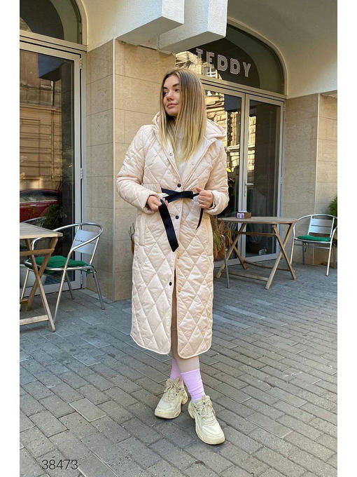 Стёганое пальто с капюшоном. Пальто из стёганной плащёвой ткани на силиконе. Объёмный капюшон, боковые прорезные карманы, затягивающийся шнурок на талии. Есть подкладка, планка на кнопках.