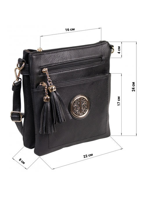 Яркий, красивый клатч прямоугольной формы. Материал – эко кожа. Аксессуары – цвета золота. Клатч закрывается на молнию. Одна длинная регулируемая ручка. Максимальная длина ручки – 135 см. Сумку можно носить cross body через плечо. На лицевой стороне расположены два кармана на молниях с двумя декоративными бегунками в виде кисточек. На задней стороне также имеется горизонтальный прорезной карман на молнии. Внутри – тканевая подкладка, три отделения. В заднем отделении с одной стороны – карман на молнии, в переднем – карманчик для мобильного телефона.