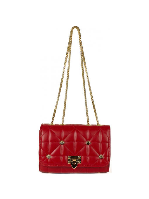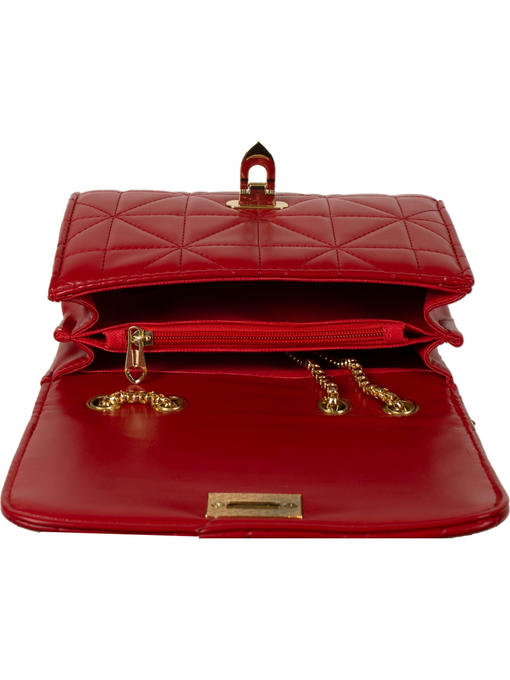 Стильный каркасный клатч. Материал – эко кожа. Аксессуары – цвета золота. На лицевой стороне сумочка украшена декоративной прострочкой в тон сумки и заклёпочками в виде шмелей. Сумка закрывается при помощи клапана на поворотном замочке. Одна оригинальная, очень красивая ручка – цепочка, которая проходит через четыре отверстия с люверсами и может носиться в разных положениях. Высота ручки в одном положении – 30 см, в другом положении – 57 см. На дне сумки имеются четыре ножки. Внутри – тканевая очень красивая подкладка ярко красного цвета, три отделения, среднее отделение закрывается на молнию.