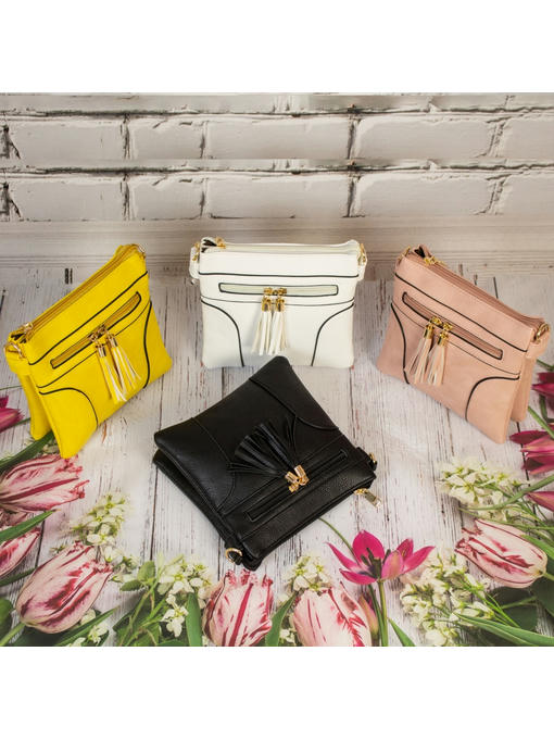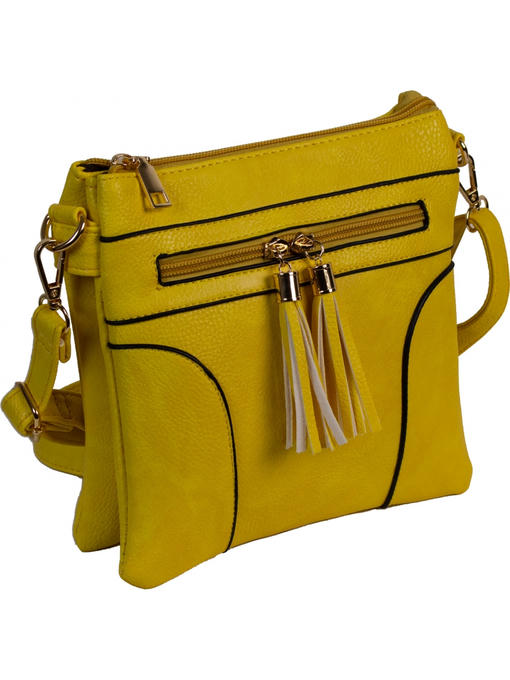 Яркий клатч прямоугольной формы. Материал – эко кожа. Аксессуары – цвета золота. Клатч закрывается на молнию. Лицевая сторона сумки также украшена чёрным кантом и декоративными строчками. На лицевой стороне расположен горизонтальный прорезной карман на молнии с двумя декоративными бегунками в виде кисточек. Одна длинная регулируемая ручка. Максимальная длина ручки – 135 см. Сумку можно носить cross body через плечо. На задней стороне сумки находится горизонтальный прорезной карман на молнии. Внутри – два больших отделения из тканевой подкладки и одно маленькое отделение из кожзаменителя (между двумя большими отделениями). В заднем отделении находится прорезной карман на молнии, в переднем – карманчик для документов.