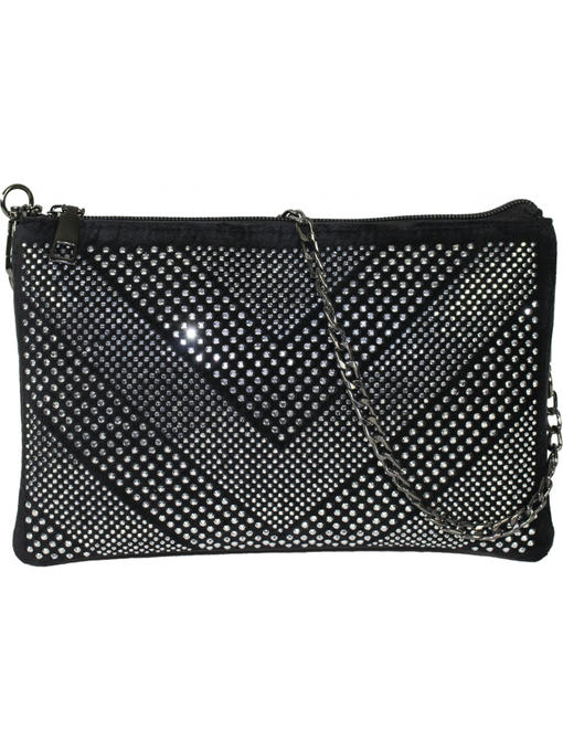 Клатч стильный и элегантный. Аксессуары – чернённые. Сумка украшена мелкими металлическими стразами. Одна ручка – цепочка. Высота ручки – 22 см, длина – 50 см.Дополнительно имеется длинная регулируемая ручка. Максимальная длина ручки – 133 см. Сумка закрывается на молнию. На задней стороне расположен горизонтальный прорезной карман на молнии. Внутри – тканевая подкладка, три отделения. В заднем отделении с одной стороны – горизонтальный прорезной карман на молнии.