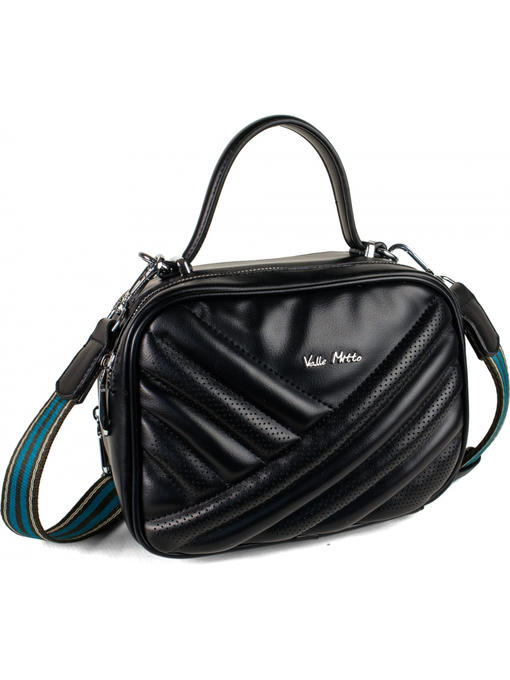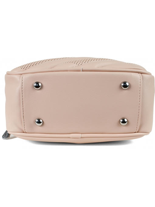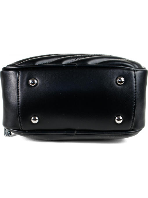 Небольшая сумочка прямоугольной формы. Материал – эко кожа. Аксессуары – никелированные. Сумка закрывается на молнии. Одна короткая нерегулируемая ручка. Высота ручки – 9 см. Широкая тканевая ручка. Ширина ручки – 4 см, максимальная длина ручки – 130 см. Сумка может носиться cross body. На лицевой стороне сумка украшена декоративными строчками в тон сумки и перфорацией. На задней стороне расположен горизонтальный прорезной карман на молнии. На дне сумки имеются четыре ножки. Внутри – тканевая подкладка, два автономных отделения, каждое из которых закрывается на молнию. В заднем отделении – горизонтальный прорезной карман на молнии, в переднем отделении – карман для документов.