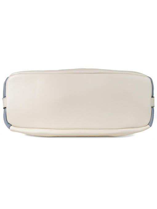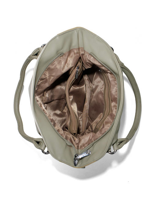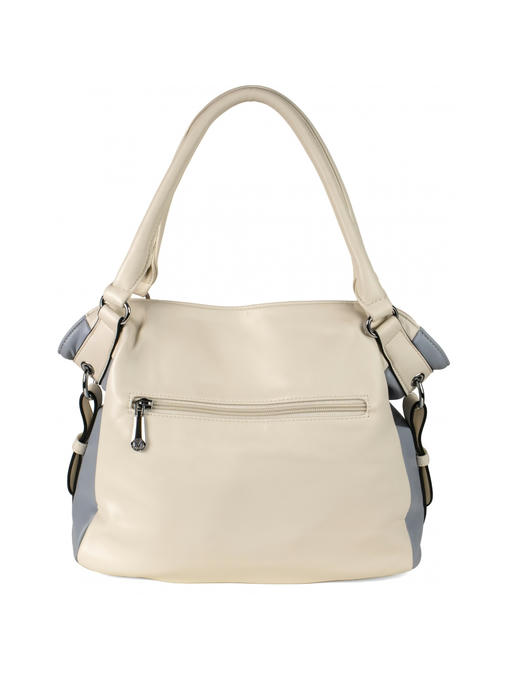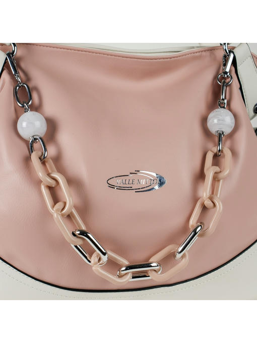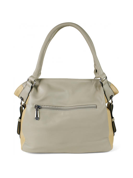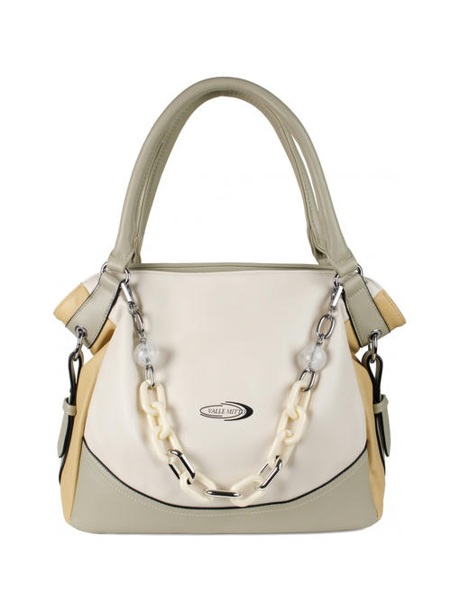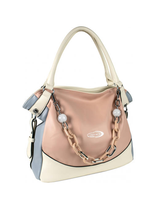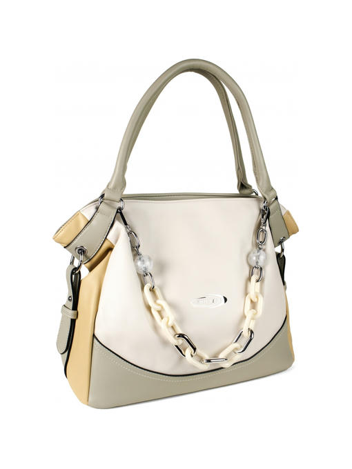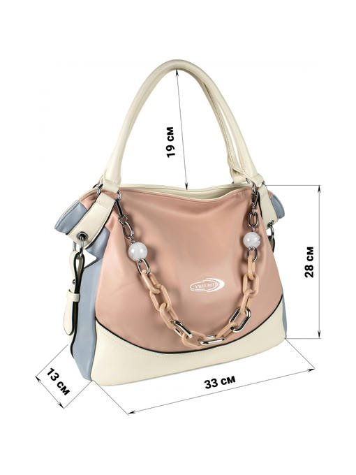 Стильная женская сумка среднего размера. Материал – эко кожа. Аксессуары – никелированные. Сумка закрывается на молнию. Две средние нерегулируемые ручки. Высота ручек – 19 см. Сумка украшена съёмной цепочкой. На задней стороне расположен горизонтальный прорезной карман на молнии. Внутри – тканевая подкладка, три отделения. Среднее отделение закрывается на молнию.С задней стороны – горизонтальный прорезной карман на молнии с рамочкой из эко кожи, с передней стороны – карманы для мобильного телефона и документов.
