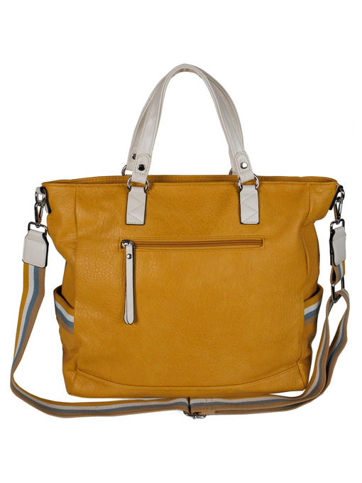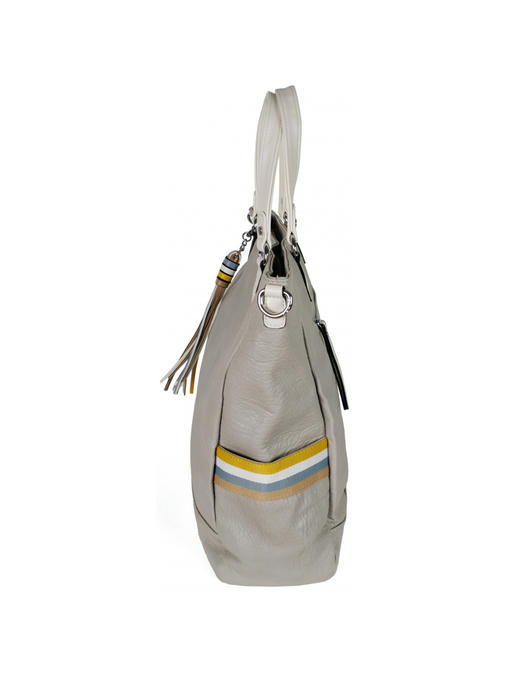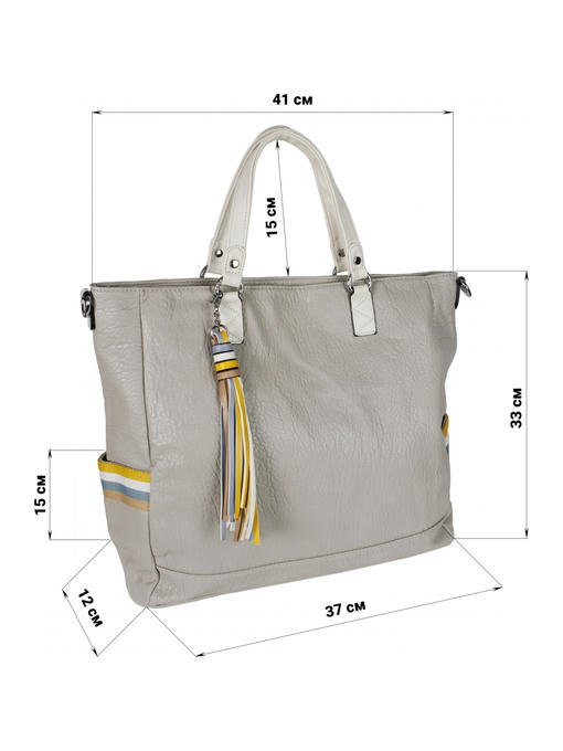Объёмная вместительная сумка помещается папка формата А4. Материал – эко кожа. Аксессуары – никелированные. Сумка украшена съёмным брелком в виде кисточки. Сумка закрывается на молнию. Две короткие нерегулируемые ручки. Высота ручек – 15 см. Дополнительно имеется длинный широкий регулируемый ремень. Ширина ремня – 4 см, максимальная длина ремня – 130 см. По бокам сумки расположены карманы. На задней стороне имеется горизонтальный прорезной карман на молнии. Внутри – тканевая подкладка, одно большое отделение. С задней стороны – два кармана на молниях. Один – горизонтальный прорезной карман с рамочкой из эко кожи, второй – в виде перегородки, с другой стороны – карманы для мобильного телефона и документов.