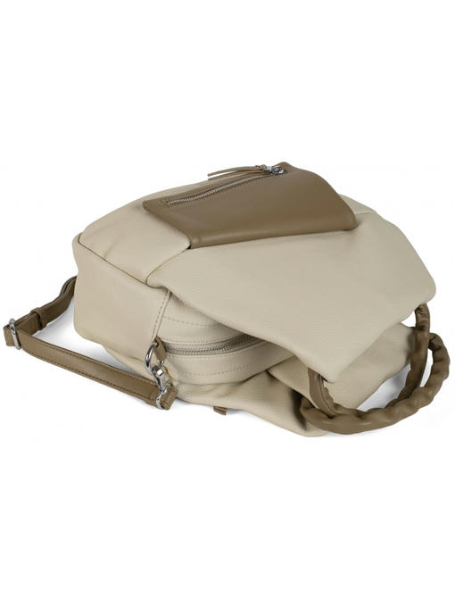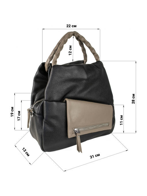 Мягкая вместительная сумка. Материал – эко кожа. Аксессуары – никелированные. Сумка закрывается на металлическую молнию. Две короткие нерегулируемые ручки – цепочки с оплёткой из эко кожи, поэтому очень удобна в руках. Высота ручек – 12 см. Дополнительно имеется длинная регулируемая ручка. Максимальная длина ручки – 125 см. На лицевой стороне сумки расположен карман с клапаном на магнитной застёжке. На задней стороне расположен горизонтальный прорезной карман на молнии. Внутри – тканевая подкладка, одно большое отделение. С задней стороны – горизонтальный прорезной карман на молнии с рамочкой из эко кожи, с передней стороны – карманы для мобильного телефона и для документов.