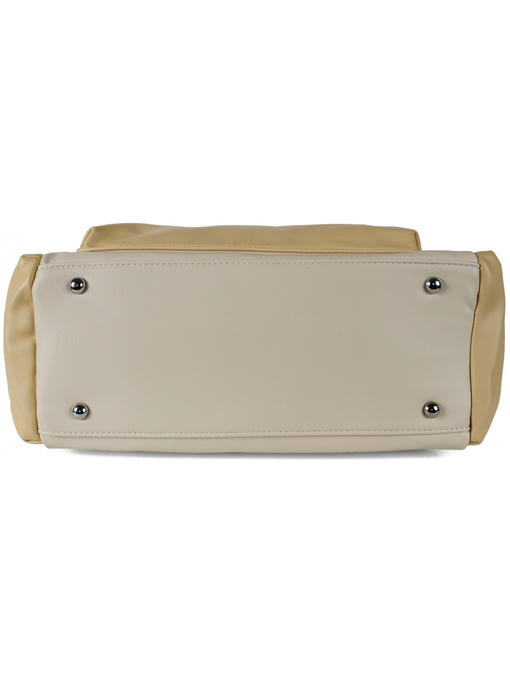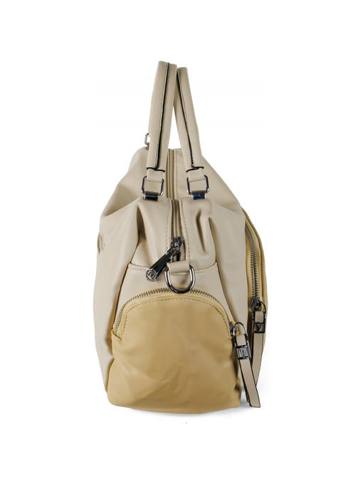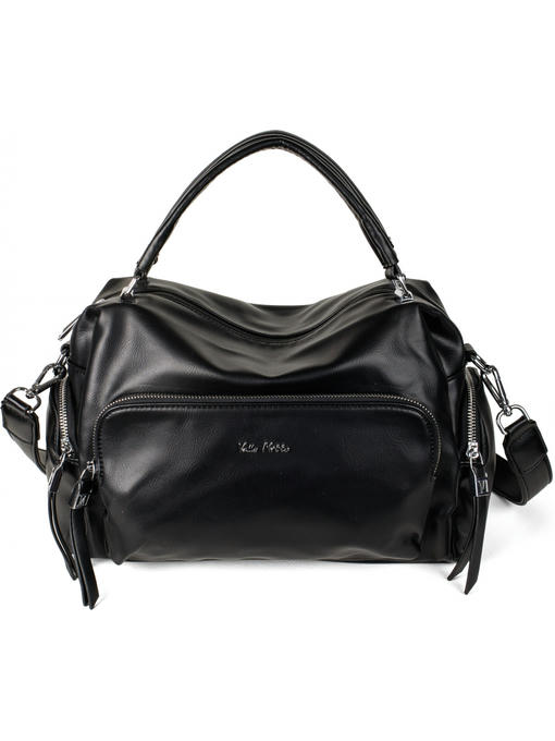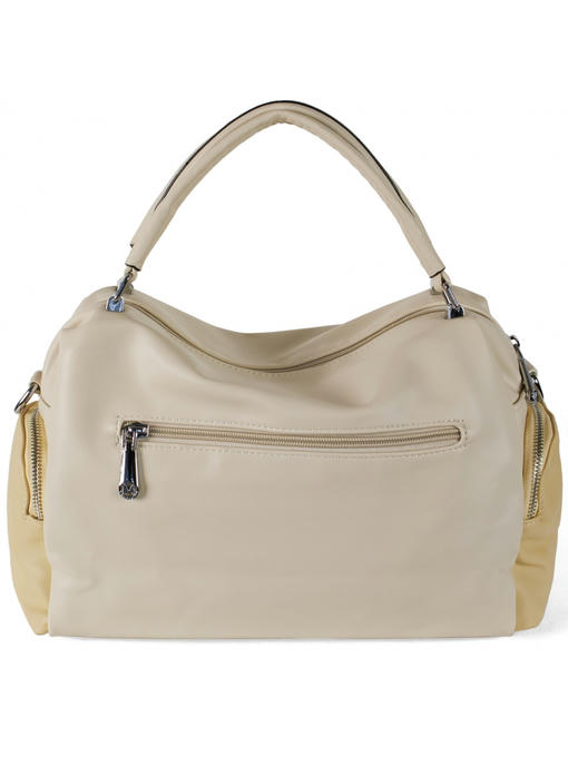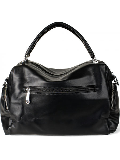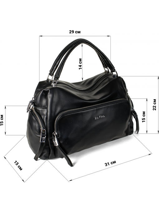 Сумочка прямоугольной формы. Материал – эко кожа. Аксессуары – никелированные. Сумка закрывается на молнию. Две короткие нерегулируемая ручки. Высота ручек – 14 см. Широкая ручка из эко кожи. Ширина ручки – 3 см, длина ручки – 90 см. На лицевой стороне сумки расположен накладной карман на металлической молнии с декоративным бегунком. По бокам расположены два накладных кармана на металлических молниях. На задней стороне расположен горизонтальный прорезной карман на молнии. На дне сумки имеются четыре ножки. Внутри – тканевая подкладка, одно большое отделение. С задней стороны – два кармана на молниях: один горизонтальный прорезной карман на молнии с рамочкой из эко кожи, второй в виде перегородки, с передней стороны – карманы для мобильного телефона и документов.