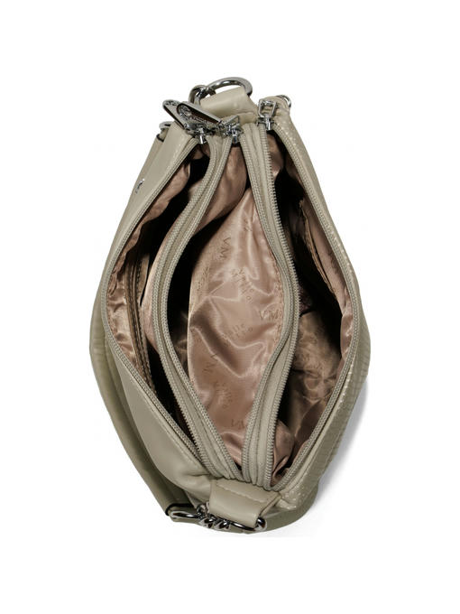 Сумочка среднего размера. Материал – эко кожа. Аксессуары – никелированные. Сумка закрывается на молнии. Одна средняя нерегулируемая ручка на цепочках. Высота ручки – 28 см. Широкая тканевая ручка. Ширина ручки – 4 см, длина ручки – 96 см. На лицевой стороне сумка украшена перфорацией. На задней стороне расположен горизонтальный прорезной карман на молнии. На дне сумки имеются четыре ножки. Внутри – тканевая подкладка, три автономных отделения, каждое из которых закрывается на молнию. В заднем отделении – горизонтальный прорезной карман на молнии с рамочкой из эко кожи, в переднем отделении – карманы для документов.