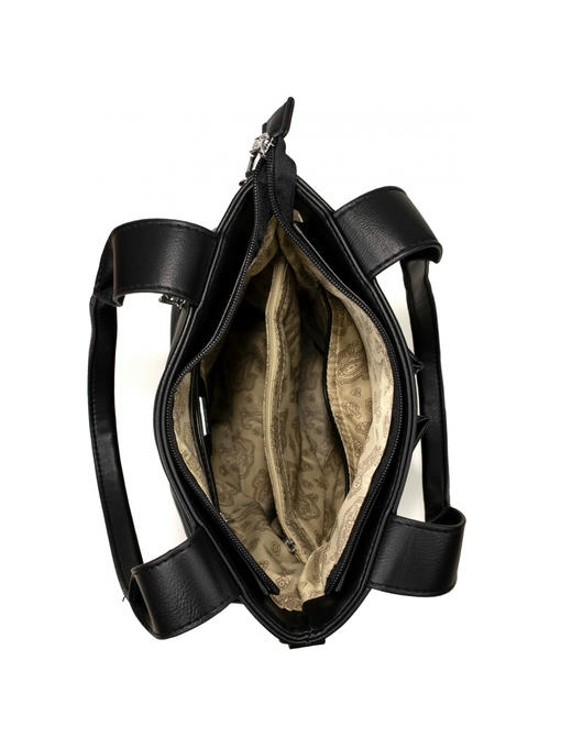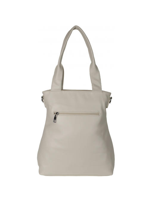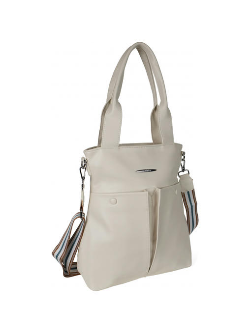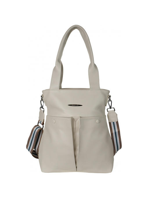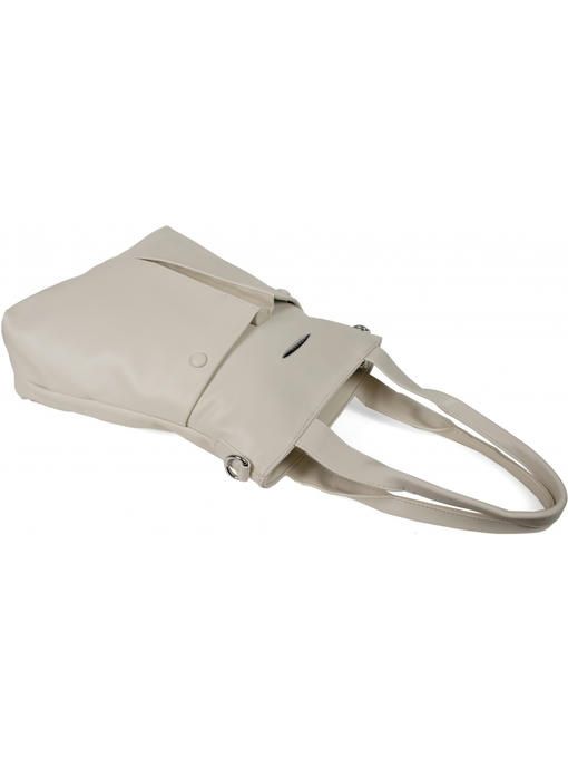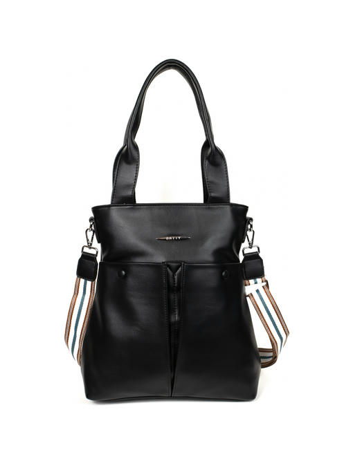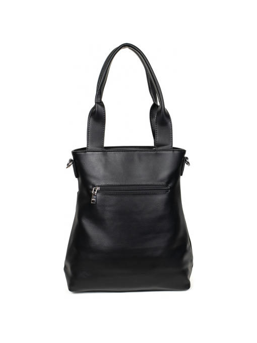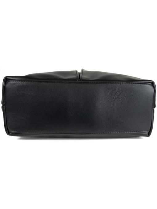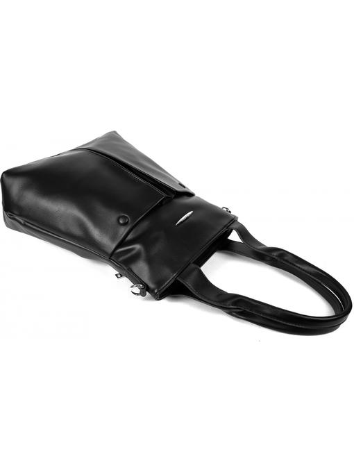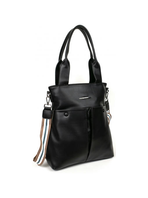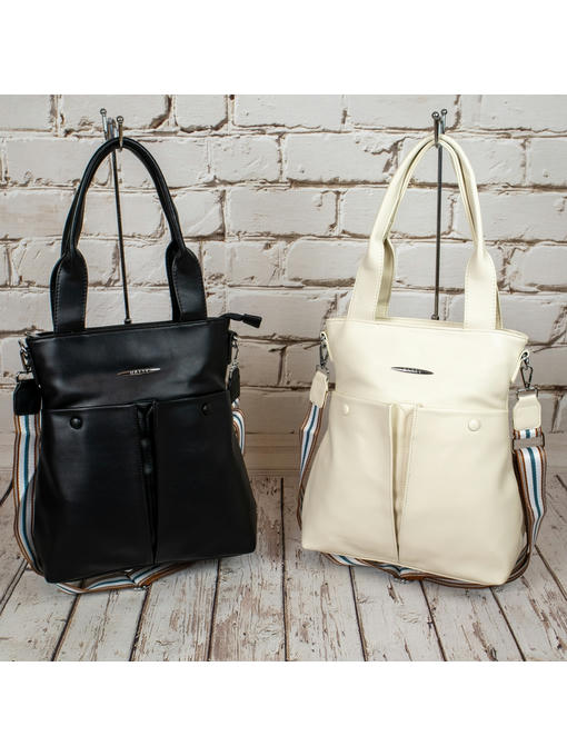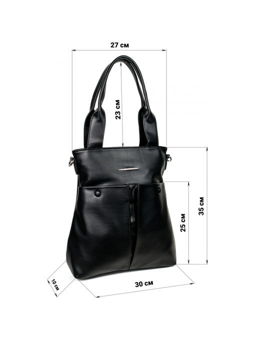 Оригинальная сумка прямоугольной формы. Материал – эко кожа. Аксессуары – никелированные. Две средние нерегулируемые ручки. Высота ручек – 23 см. Дополнительно имеется широкая регулируемая тканевая ручка. Ширина ручки – 4 см, максимальная длина ручки – 130 см. Сумка закрывается на молнию. На лицевой стороне расположены два больших кармана на магнитных застёжках. На задней стороне имеется горизонтальный прорезной карман на молнии. Внутри – тканевая подкладка, три отделения. Среднее отделение закрывается на молнию.С задней стороны – горизонтальный прорезной карман на молнии с рамочкой из эко кожи, с передней стороны – карман для документов.