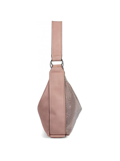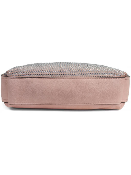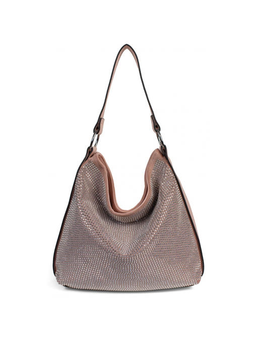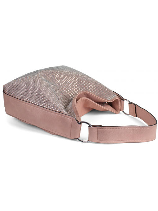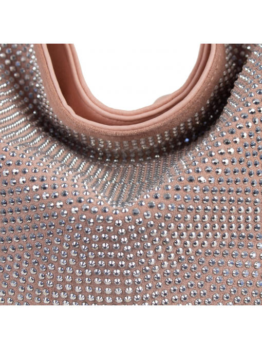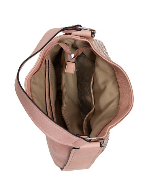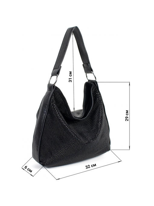Материал – комбинация эко кожи и искусственной замши со стразами. Аксессуары – никелированые. Одна средняя нерегулируемая ручка. Высота ручки – 31 см. Дополнительно имеется длинная регулируемая ручка. Сумка закрывается на молнию. На лицевой стороне сумка украшена большим количеством стразов. На задней стороне расположен горизонтальный прорезной карман на молнии. Внутри – тканевая подкладка, три отделения, среднее отделение закрывается на молнию. С одной стороны- прорезной карман на молнии, с другой- карманы для мобильного телефона и документов.