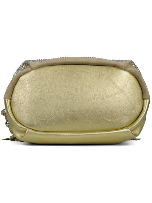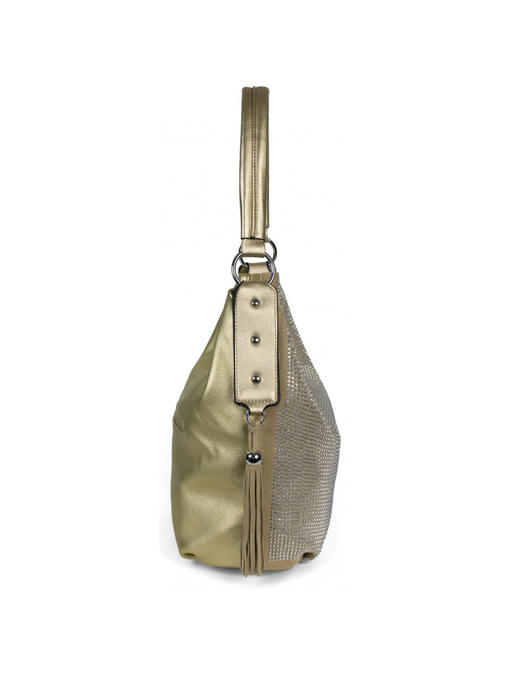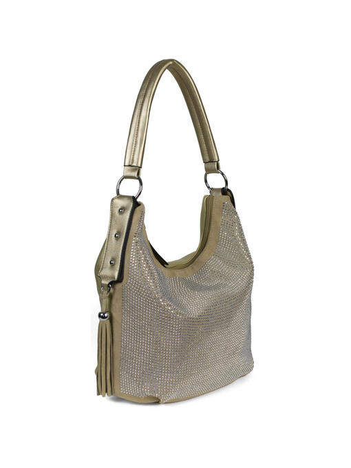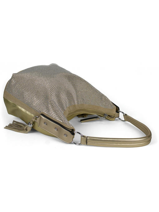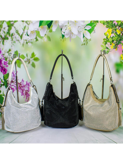 Материал – комбинация эко кожи, искусственной и натуральной замши. Аксессуары – никелированные. Одна средняя нерегулируемая ручка. Высота ручки – 32 см. Дополнительно имеется длинная регулируемая ручка. Сумка закрывается на металлическую молнию. На лицевой стороне сумка украшена большим количеством стразов в тон сумки и кисточками из натуральной замши по бокам. На задней стороне расположен горизонтальный прорезной карман на молнии. Внутри – тканевая подкладка, три отделения, среднее отделение закрывается на молнию. С одной стороны- прорезной карман на молнии, с другой- карманы для мобильного телефона и документов.