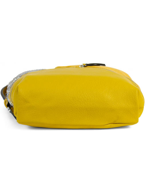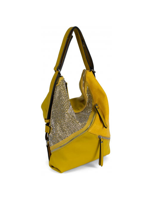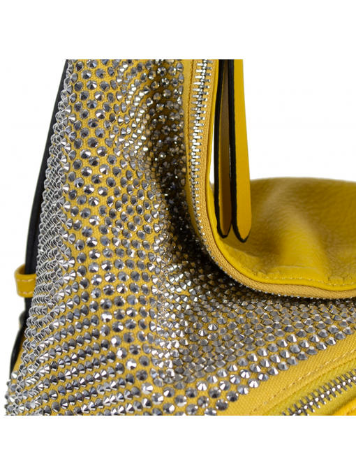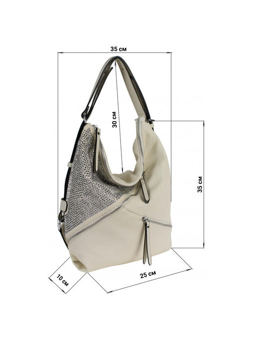 Материал – комбинация экокожи разного тиснения и плотной хлопковой ткани, украшенной стразами. Аксессуары – никелировнные. Одна средняя регулируемая ручка. Высота ручки – 30 см. Сумка закрывается на металлическую молнию. На лицевой стороне сумка украшена большим количеством стразов. На лицевой стороне находятся два диагональных прорезных кармана на металлических молниях. На задней стороне расположен горизонтальный прорезной карман на молнии. Внутри – тканевая подкладка, одно большое отделение. С одной стороны- прорезной карман на молнии, с другой- карманы для мобильного телефона и документов.