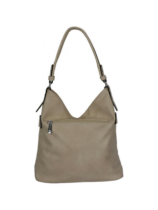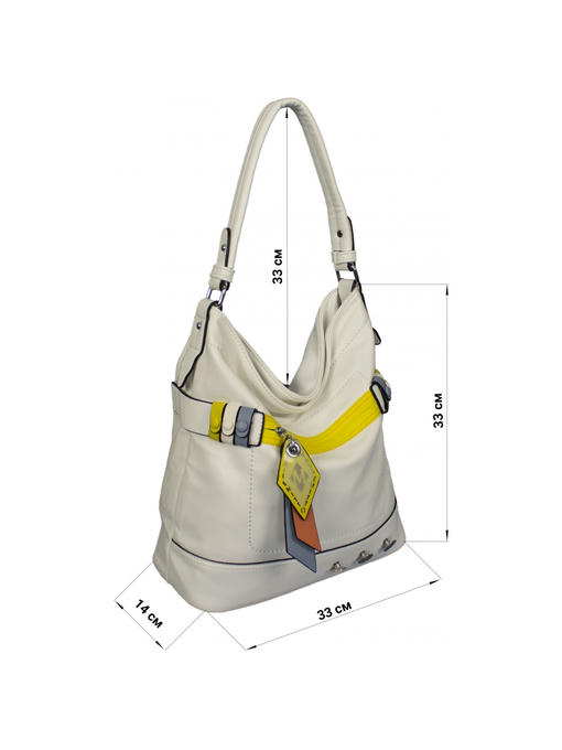 Аксессуары – никелированные. Одна средняя нерегулируемая ручка. Высота ручки – 33 см. Сумка закрывается на молнию. На лицевой стороне сумка украшена пуговичками, цветными френчиками, потайным горизонтальным прорезным карманом на молнии с бекунком, украшенным брелоком с разноцветными подвесками. На задней стороне расположен горизонтальный прорезной карман на молнии. на дне сумки имеются ножки. Внутри – тканевая подкладка, три отделения. Среднее отделение закрывается на молнию. С одной стороны – горизонтальный прорезной карман на молнии, с другой стороны – карманы для мобильного телефона и документов.