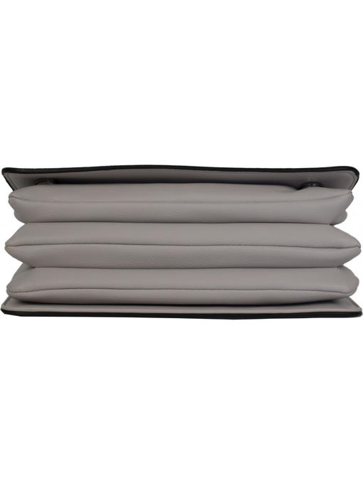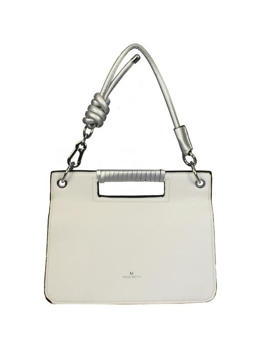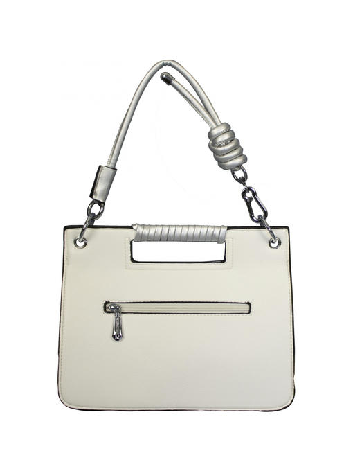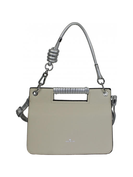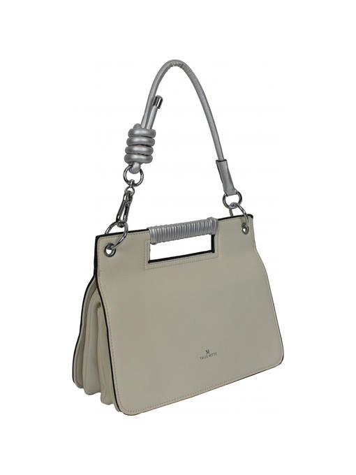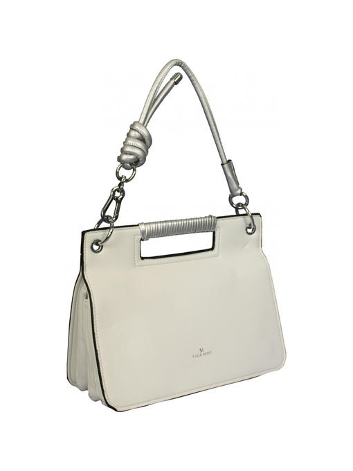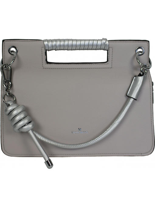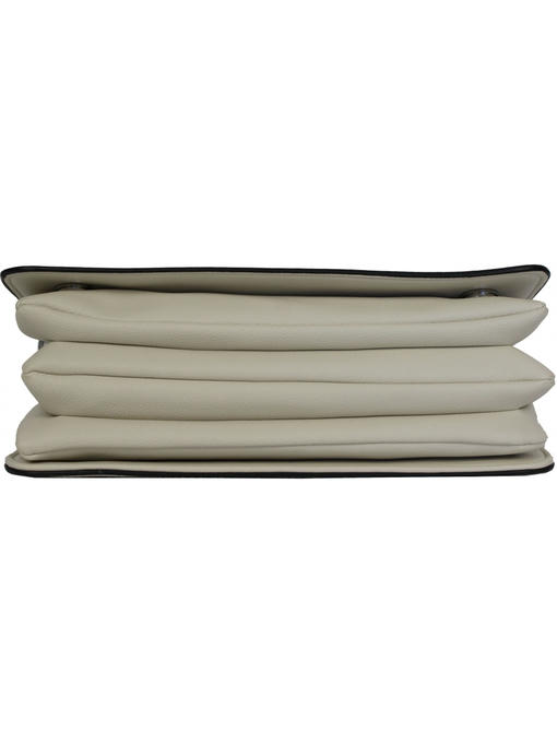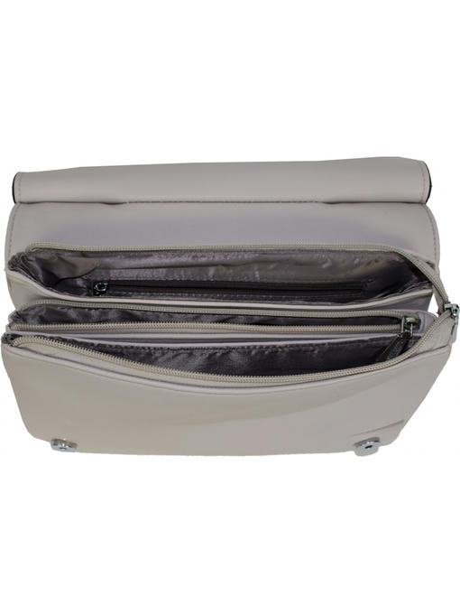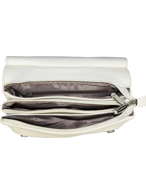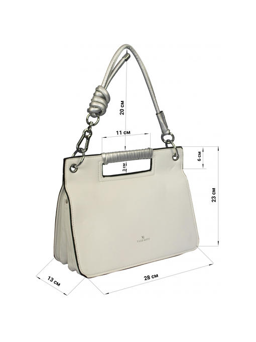 Очень оригинальная сумочка небольшого размера. Аксессуары – никелированные. Одна средняя нерегулируемая ручка. Высота ручки – 20 см. Дополнительно имеется длинная регулируемая ручка. Максимальная длина ручки 135 см. Сумка закрывается на молнию и при помощи клапана на двух магнитных застёжках. На задней стороне расположен горизонтальный прорезнолй карман на молнии.На лицевой стороне под клапаном расположены два отделения. Одно большое на молнии, второе маленькое. Внутри отделения на молнии – тканевая подкладка 5 отделений. Среднее отделение закрывается на молнию. В заднем отделении – горизонтальный прорезной карман на молнии.