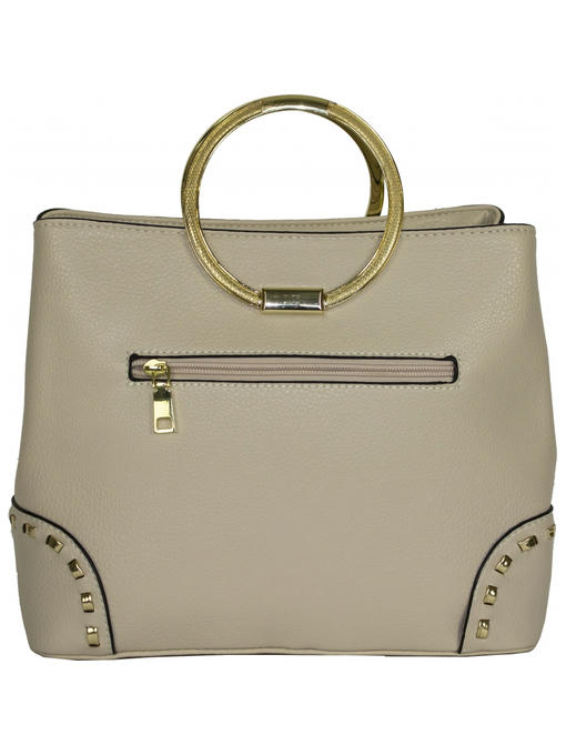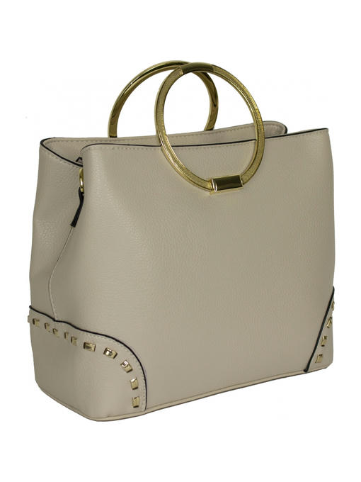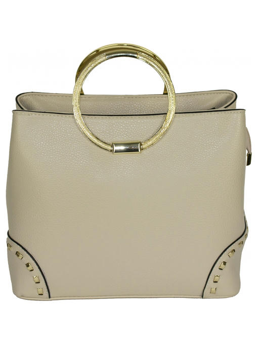 Материал – экокожа. Аксессуары – цвета золота на бежевом и белом цвете и чернённые на черной сумке. Сумка – полужёсткая, хорошо держит форму. Две короткие круглые металлические ручки. Диаметр ручек – 10 см. Дополнительно имеется длинная регулируемая ручка. Сумка закрывается на молнию. На задней стороне расположен горизонтальный прорезной карман на молнии. Внутри – тканевая подкладка, три отделения. Среднее отделение закрывается на молнию. С одной стороны – карман на молнии, с другой стороны – карманы для мобильного телефона и документов.