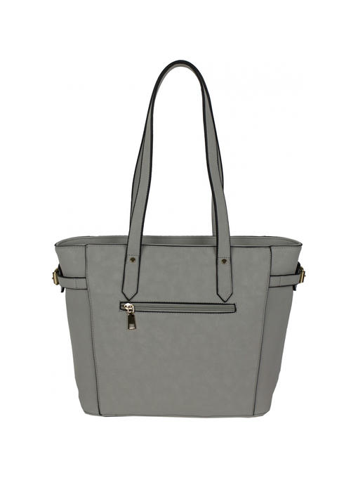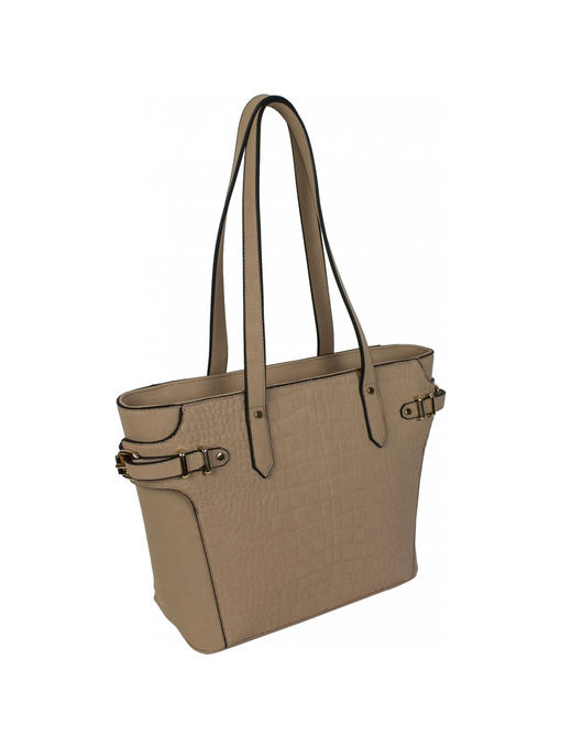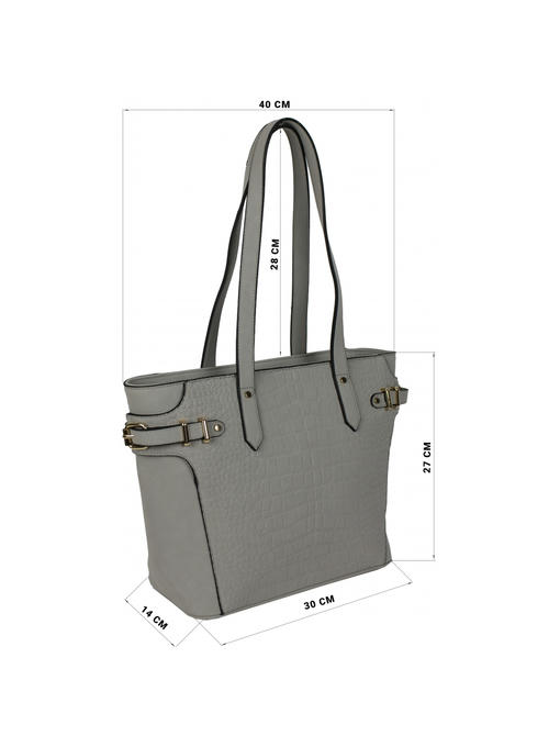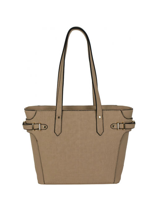 Сумка – полужёсткая, хорошо держит форму. Аксессуары – цвета золота. Две средние нерегулируемые ручки. Высота ручек – 28 см. Сумка закрывается на молнию. На задней стороне расположен горизонтальный прорезной карман на молнии. Внутри – тканевая подкладка, одно большое отделение. С одной стороны- прорезной карман на молнии, с другой- карманы для мобильного телефона и документов.