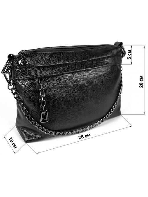 Сумка-клатч. Материал – кожзаменитель. Аксессуары – чернённые. На лицевой стороне сумка украшена съёмной декоративной цепочкой. Также на лицевой стороне клатча под клапаном находится горизонтальный прорезной карман на молнии. Одна длинная регулируемая ручка. На задней стороне расположен горизонтальный прорезной карман на молнии. Внутри – тканевая подкладка, два отделения, закрывающиеся на молнии. В одном отделении находится прорезной карман на молнии, в другом – карманчики для мобильного телефона и документов.
