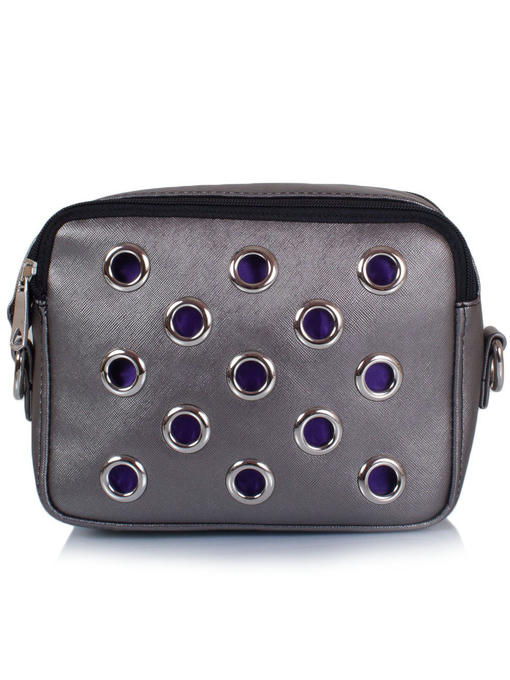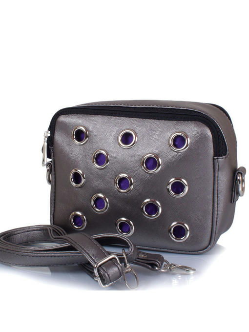 Серебристо-бежевый, блестящий на свету тонко проработанной фактурной поверхностью материал использовали дизайнеры для изготовления этого своеобразного клатча. Модерновый характер задает ему лицевая сторона с круглыми прорезями, отделанными металлическими колечками золотистого цвета. Смотрится это необычно в ансамбле с фиолетовой подкладкой, которая проглядывает изнутри. Прямоугольная форма со скругленными углами, значительная ширина боков, верха и нижней части, аккуратная внутренняя отделка позволяют разместить в такой сумочке массу мелких предметов – кошелек, телефон, косметику, ключи и даже компактный зонтик-малышку. Удобный аксессуар оснащен пристежным плечевым ремнем и двумя сподручными застежками-«молниями»