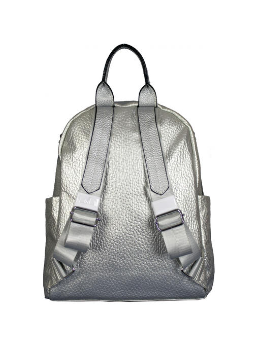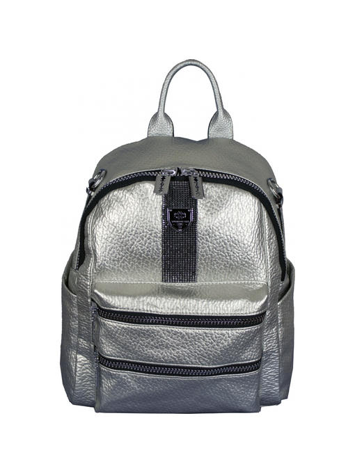 Оригинальная сумка – рюкзак. Большой и вместительный. Аксессуары – никелированные. Одна короткая нерегулируемая ручка-петля. Высота ручки – 10 см. Дополнительно имеются одна широкая съёмная ручка среднего размера (высота ручки – 27 см) и две регулируемые лямки рюкзака на спине. Сумка закрывается на широкую металлическую молнию с двумя декоративными бегунками в форме лезвий. На лицевой стороне сумка украшена двумя горизонтальными карманами на широких металлических молниях с бегунком в форме лезвий и пришита апликация с металлическими стразами.По бокам расположены два втачных кармана. Внутри – тканевая подкладка, одно большое отделение. С одной стороны- горизонтальный прорезной карман на молнии, с другой стороны – карман для мобильного телефона.