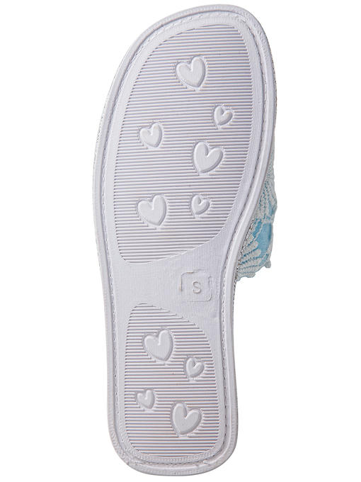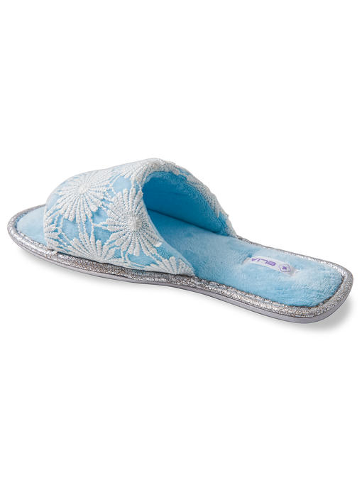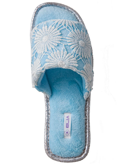 Классические тапочки с открытым мысом на прорезиненной подошве, выполнены из нежного голубого велюра (50% хлопок 50% полиэстер), верхняя часть тапочка (ширина верхней части – 8,3 см) покрыта белым кружевом в форме цветков (диаметр цветков – 4,5 см). Окантовка подошвы выполнена из стилизованного серебристого материала. Упакованы в прозрачный полиэтиленовый пакет, внутри пакета находится пластмассовая бежевая вешалочка. Мягкий материал дарит ощущение уюта и комфорта, а открытый мысок позволяет ноге дышать и поддерживать комфортную температуру. Тапочки идеально подойдут для ношения дома, на даче, а также это прекрасная идея для подарка.