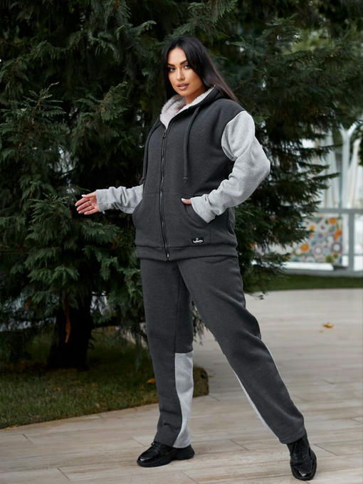 На меху согреет в холодную погоду. Куртка на флисе с овчиной. Свободного кроя. Застегивается на застежку “молния”. Карман “кенгуру” Брюки тринитка на флисе.