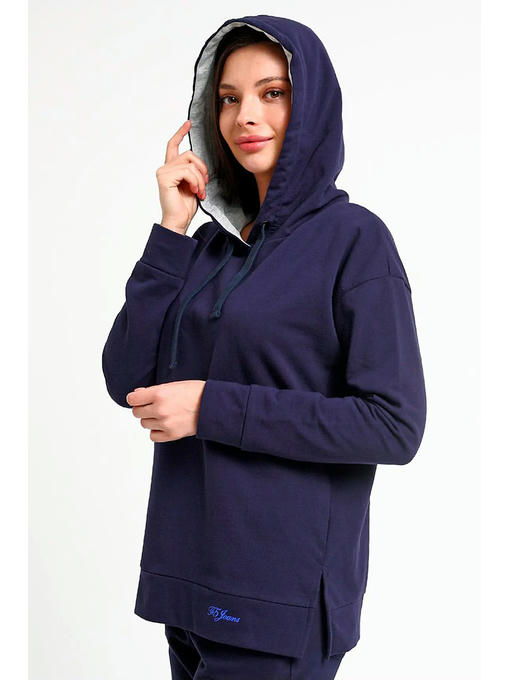 Женская толстовка в спортивном стиле Comfort fit (свободного покроя). Выполнена из комфортного трикотажного полотна футера. Длинные рукава с манжетами, удобный капюшон на подкладке цвета экрю с хлопковым белым плоским шнуром. В боковых швах разрезы