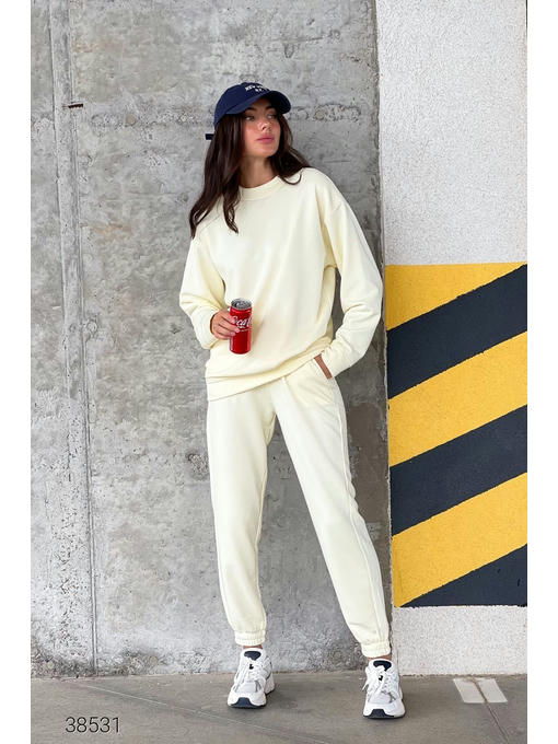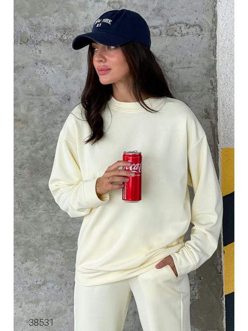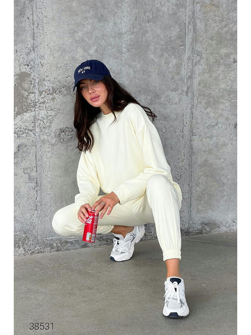 Трикотажный костюм из свитшота и джоггеров. Ткань – качественная турецкая трехнить петля. Свитшот с заниженной линией плеч. Джоггеры с поясом на резинке, боковые прорезные карманы, манжет резинка. Размер универсальный, подходит на 42 – 48.
