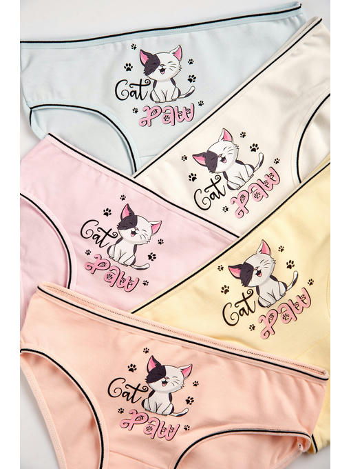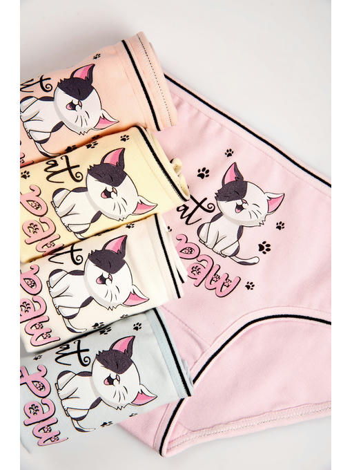 Практичный набор детского нижнего белья выполнен из мягкой хлопковой ткани, которая имеет нежную и прочную текстуру. Эластан в составе обеспечивает удобную посадку по фигуре. Трусики сохраняют прекрасный внешний вид даже после частых стирок. В наборе представлены слипы в нежных оттенках с милым принтом Котик.