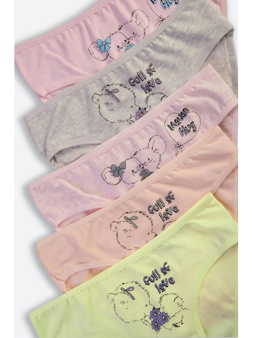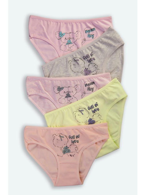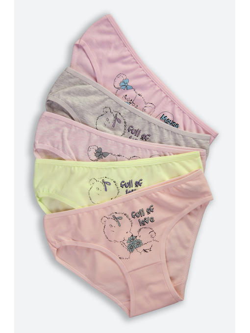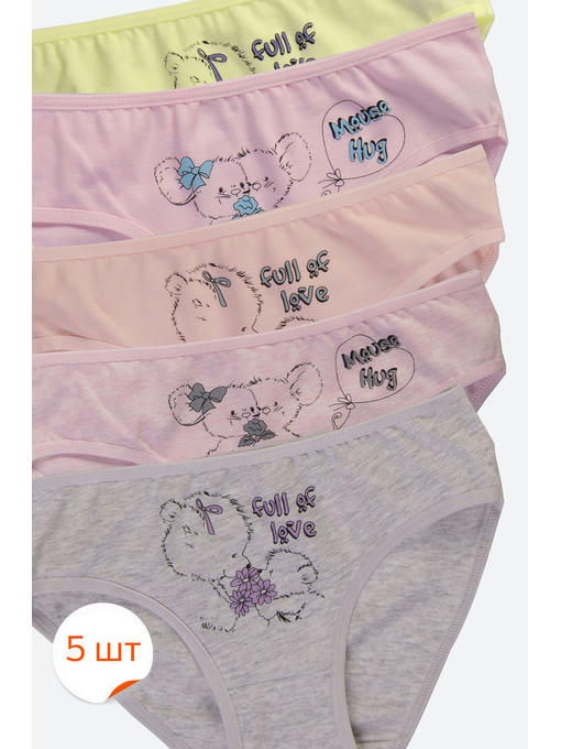 Набор трусиков слипов для девочек представлен в нежных пастельных тонах, в комплекте 5 штук. Трусы слипы украшены милым принтом Медвежата и Мышки. Детские трусики выполнены из натурального трикотажного хлопка с добавлением эластана.