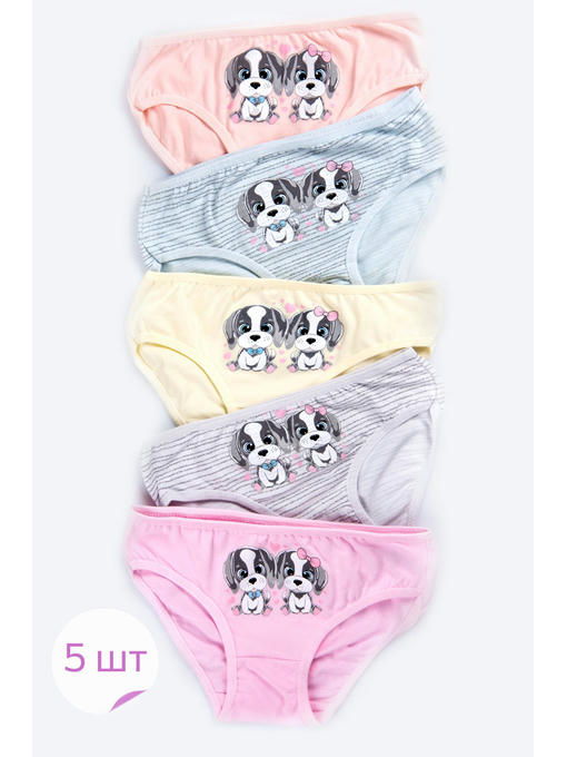 В наборе представлены трусы нежно-пастельных оттенков с милым принтом собачки. Все швы ровные, гладкие, предусмотрена хлопковая ластовица. Благодаря эластичным резинкам белье удобно сидит и почти не ощущается на теле. Трикотажные трусики не стесняют движений, обеспечивая комфорт в течение всего дня.