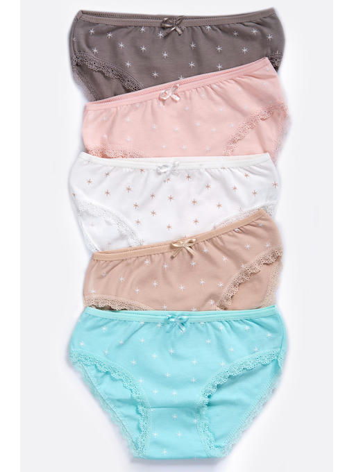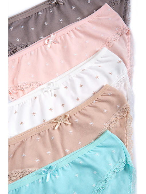 В наборе представлены трусы нежных оттенков с принтом звездочки, милым атласным бантиком и кружевными проймами. Все швы ровные, гладкие, предусмотрена хлопковая ластовица.