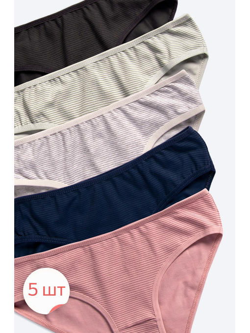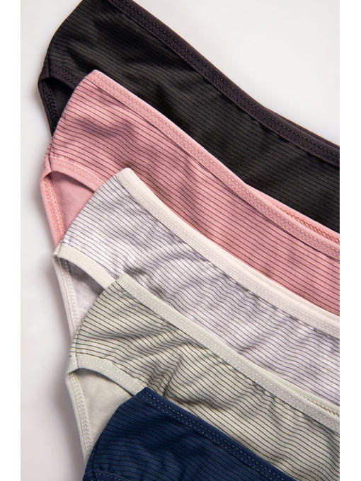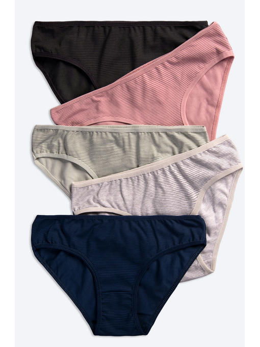 Трусики в полоску для девочек и подростков представлены в базовых тонах: синий, бежевый, молочный, розовый и коричневый. Набор из 5 штук трусиков выполнен из натурального хлопка с добавлением эластана.