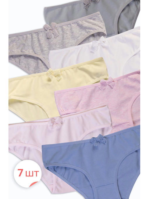 Мягкие и удобные детские трусы для девочки подростка сшиты из трикотажной ткани с высоким содержанием хлопка в составе. Благодаря добавлению эластана трусики для девочек набор плотно прилегают к телу. Трусики для девочки обеспечивают максимальный комфорт за счет мягкости и эластичности белья детского для девочек. Однотонные трусы украшены кружевным бантиком, в наборе 7 шт.