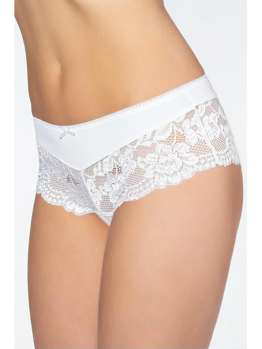 Шортики из хлопка с эластаном, снизу объемная кружевная вставка, края отделаны ажурной тесьмой, аппликация-бантик на фронте